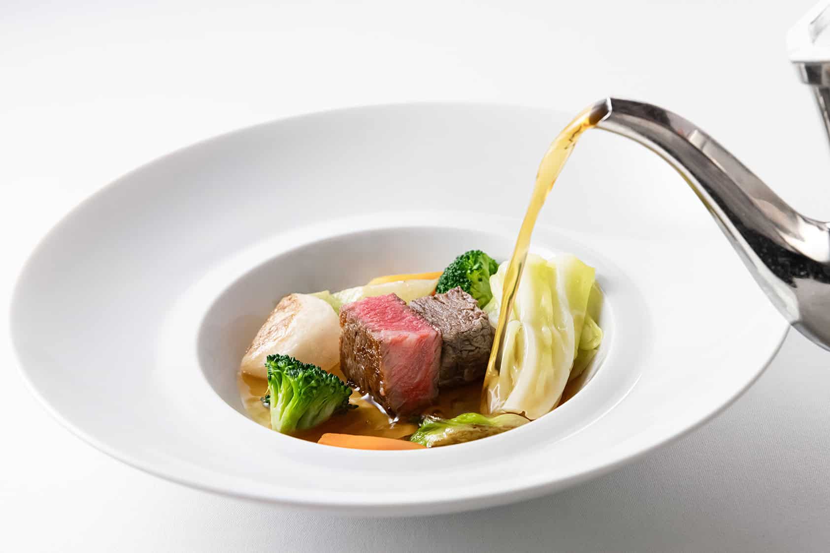 低温でゆっくりと火をいれ、コンソメにも旨みが溶け込むように仕立てたバラ肉と、肉の香りと脂のくちどけの良さを際立たせたサーロインを使ったポトフ。鳥取テロワール野菜は、坂田農園のブロッコリーやカブ、ニンジン、キャベツなどを使用。