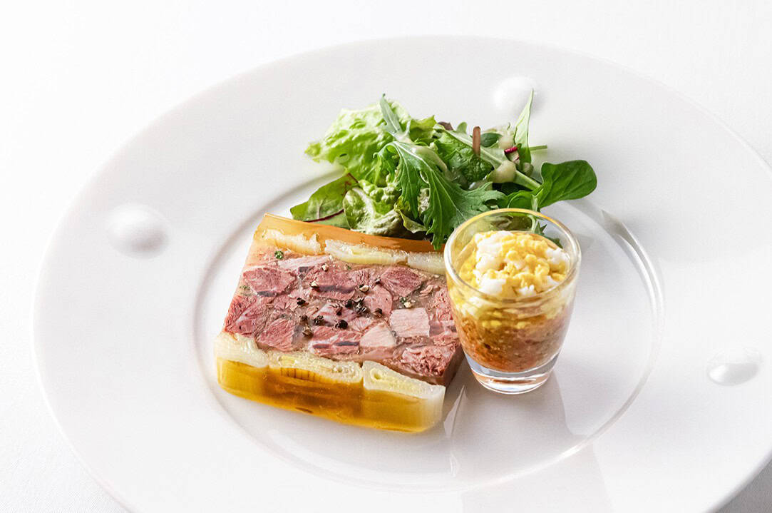鳥取和牛オレイン55のスネ肉を香味野菜と煮込んだ出汁でしっとりと固めたテリーヌ。シェリービネガー、トマト、ケッパーを合わせたやや酸味のあるグリビッシュソースをかけていただきます。