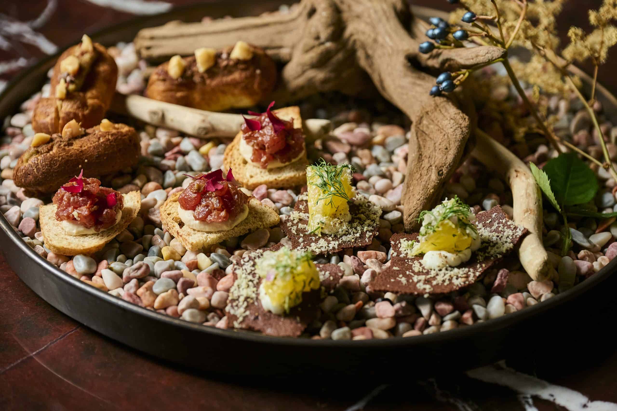 シグニチャーメニューのエクレアにショコラニブを合わせたエクレアやスパイスショコラを合わせたタルタルなどバレンタインらしい⼀⼝アミューズを盛り合わせに♡