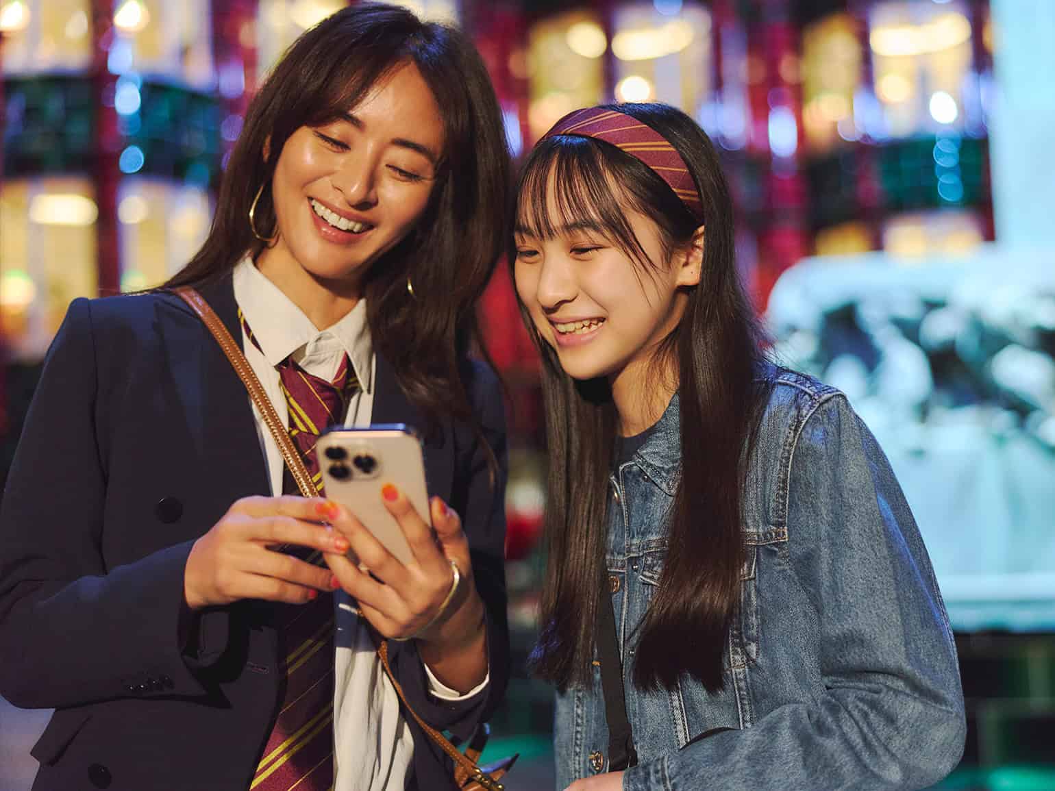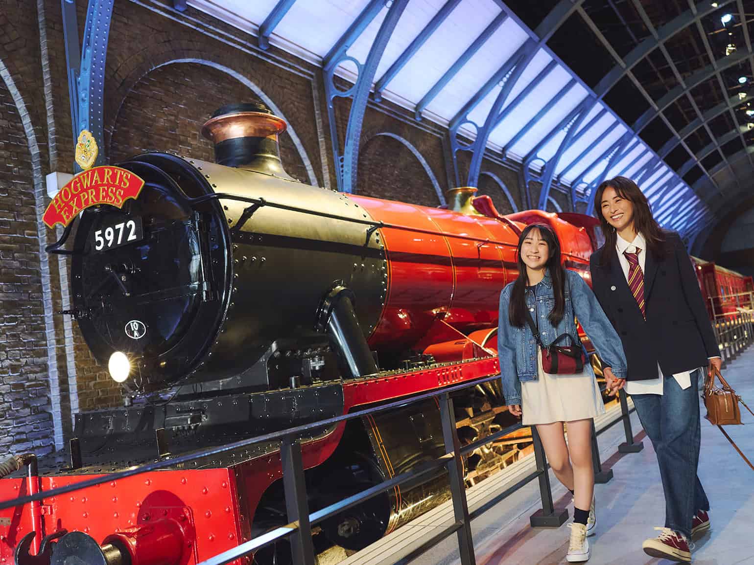 ホグワーツ魔法魔術学校へ向かう生徒たちがカートを押しながら壁をすり抜ける名シーンを再現できるフォトスポットで記念撮影。親子でリンクコーデをすれば、思い出に残る素敵な写真が自然に撮れます。コーデの軸はネイビー×デニム。そこに施設で購入できる、ネクタイやマフラー、カチューシャなどの小物で今季トレンドのボルドーを効かせるのがポイント。大人コーデにもマッチし、さりげなく世界観に寄り添えます。長時間歩くから足元は歩きやすいスニーカーがおすすめ。グリフィンドール カチューシャ¥1,000 グリフィンドール ハウス ネクタイ¥2,800 グリフィンドール エンブレム マフラー¥3,400