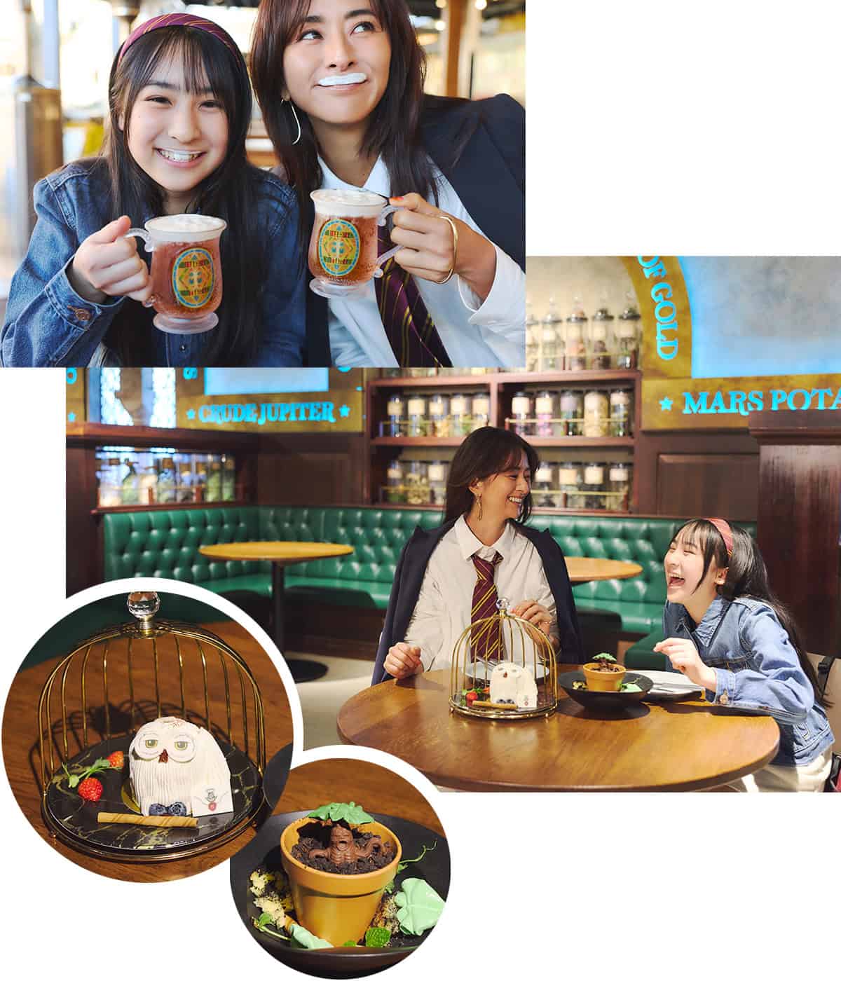 カフェの隣には世界最大の「バタービールバー」も。バタースコッチ風味のノンアルコール飲料で、歩き疲れた体に嬉しいエネルギーチャージ。映画の主人公気分で口ひげをつけて写真映えも忘れずに。食でも魔法の世界に浸りながら、親子でハリポタ愛再熱です! へドウィグケーキ¥1,700 マンドレイク チョコレートトライフル¥1,600 バタービール¥1,250