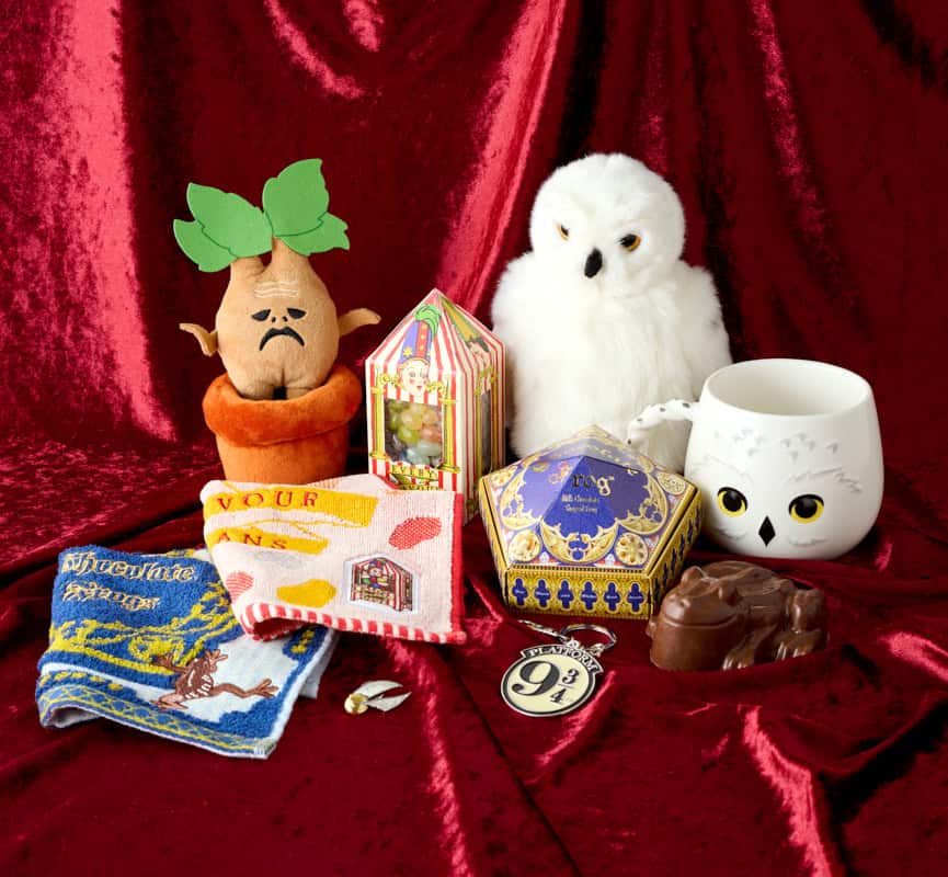 エントランス近くにある「メインショップ」に足を踏み入れると、パステルやビビッドカラーを効かせたグッズたちに一気に心奪われます。中でも棚一面のミニタオルは、子ども用に…と思いきや、つい自分用にも手に取りたくなる可愛さ。親子でシェアできて、バッグにさりげなくレイヤードしたいミニチャームも大充実です。さらに、奥まで足を延ばすとインテリアとしても楽しめるぬいぐるみやマグなど、心ときめくアイテムがずらり。世界観あふれるフォトジェニックなお菓子は、ギフトにも間違いなし。3,000点以上がそろうショップで、ツアーの余韻をそのまま自宅へ。魔法の世界を、日常の中でも楽しめます。【左から】蛙チョコレート タオルハンカチ¥770 ミニマンドレイク ぬいぐるみ¥500 百味ビーンズ タオルハンカチ¥770金のスニッチ ピンバッジ¥1,000 バーティー・ボッツの百味ビーンズ¥1,900 ヘドウィグ ぬいぐるみ中¥2,600 蛙チョコレート ミルク¥1,200 9と3/4番線 キーチェーン¥1,300 ヘドウィグ コージー マグカップ¥1,800