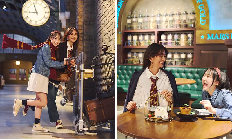 合間にほっとひと息つける休憩スポットも充実。「ヘドウィグケーキ(左)」は、イチゴ・バナナ・カスタードが層になったドーム型ケーキ。甘さ控えめでシンプルな味わいで、美食家な佳子さんも思わず「美味しい!」と声に出すほど。もうひとつ外せないのが、薬草学でおなじみの「マンドレイク チョコレートトライフル(右)」はチョコクランチの“土”の中にスポンジとチョコレートとベリーソースが。引っ張りたくなるビジュアルと、ビター×甘酸っぱい味わいのバランスが秀逸です。
