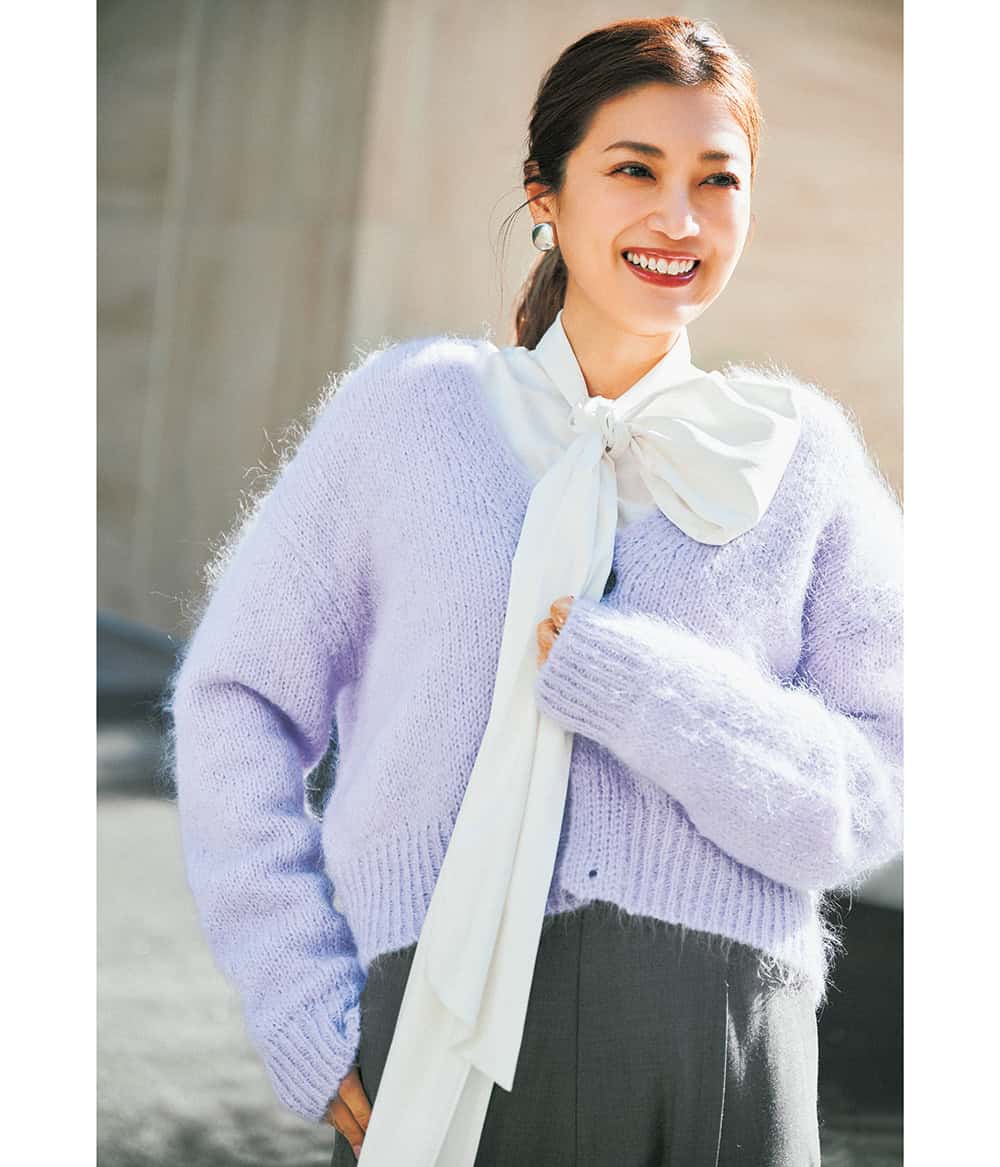 <TOP写真>カーディガン¥26,400パンツ¥27,500(ともにミースロエ)ブラウス¥19,910(FRAY I.D/FRAY I.Dルミネ新宿店)ピアス¥12,100(ニナ・エ・ジュール/ショールーム ロイト)