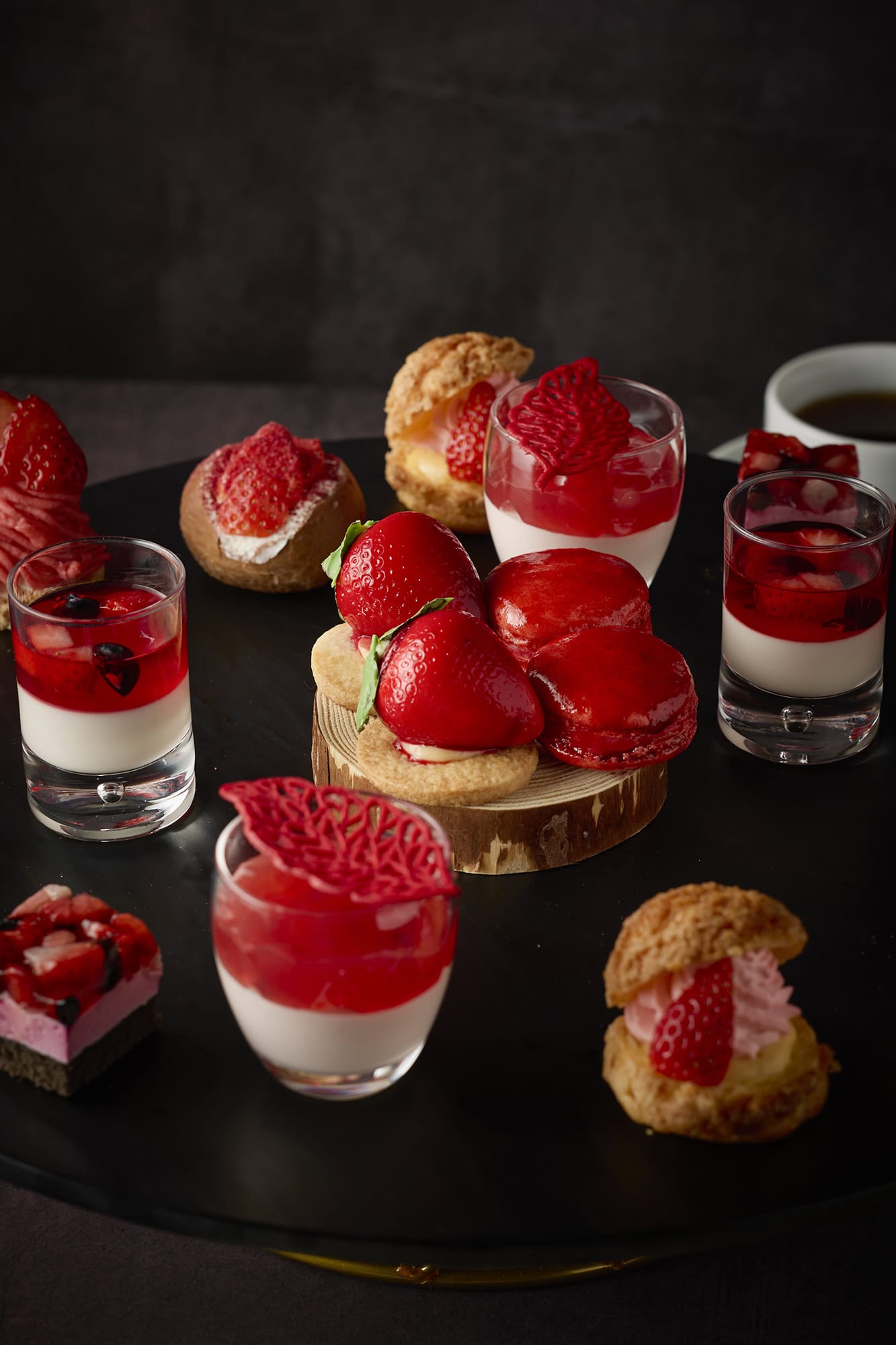 ピンクのクリームが印象的な〝いちごのモンブラン〟をはじめ、イタリアの伝統的なシュークリームの〝ビニエ〟、いちごに見立てた〝セミフレッド〟、艶やかな〝ルージュマカロン〟など、味わいだけでなく視覚的な美しさにもこだわったラインナップ。セイボリーやティー&コーヒーとともにお楽しみください。
