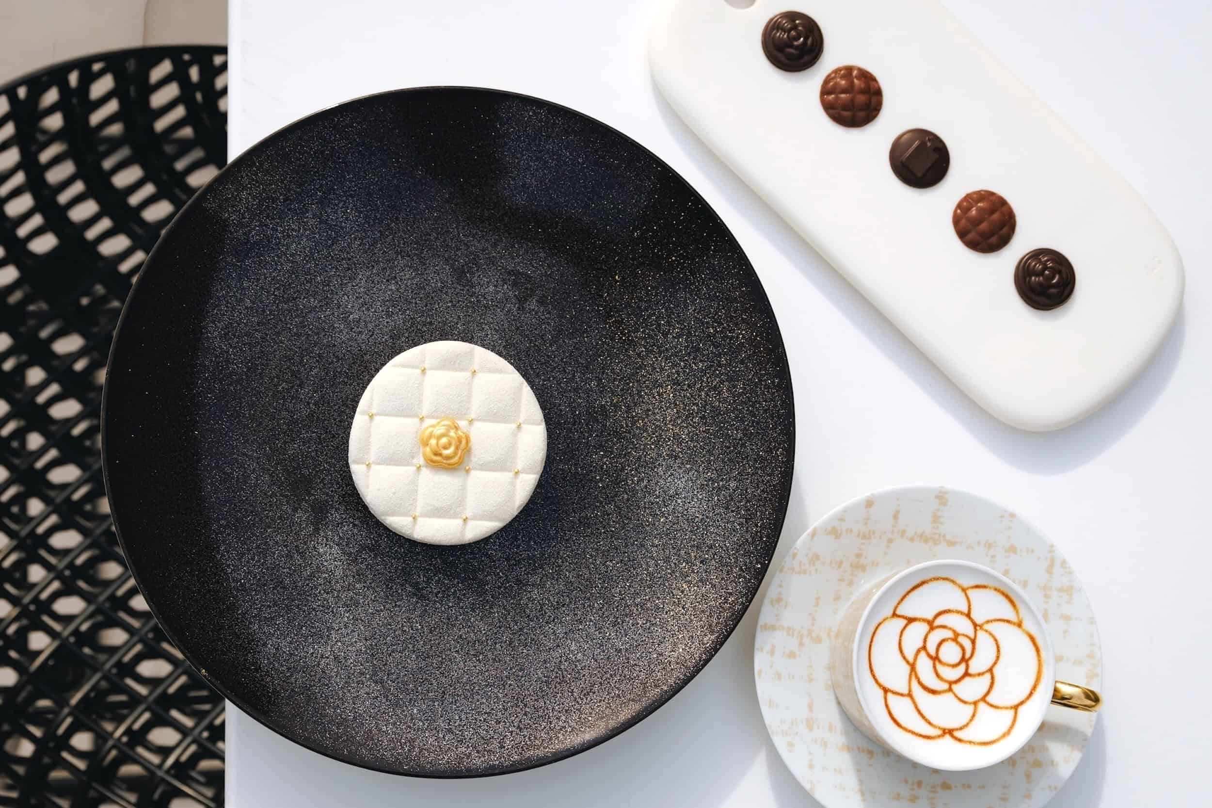 ゴールドのカメリアのチョコレートをトップにあしらった、キルティングを思わせる真っ⽩なムースケーキに、カメリアなどをモチーフにした「ブトンショコラ」とドリンクを合わせたティーセット。