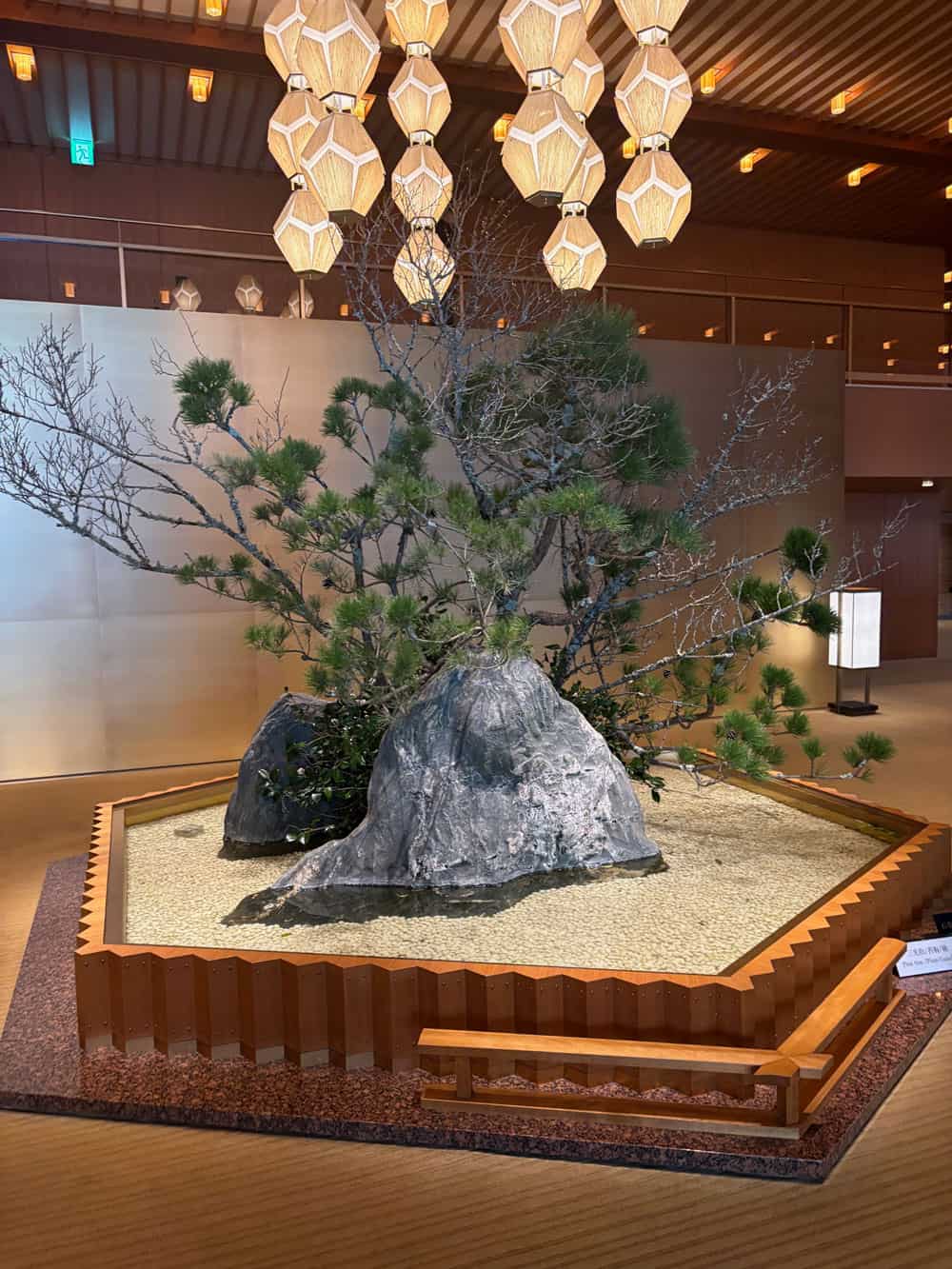 現代モダニズムと日本の伝統を象徴するロビー、ランタンと生け花(木?)に、「これがオークラ」という品格があって、媚びてない感じがして素敵です。(偉そうにすみません!)