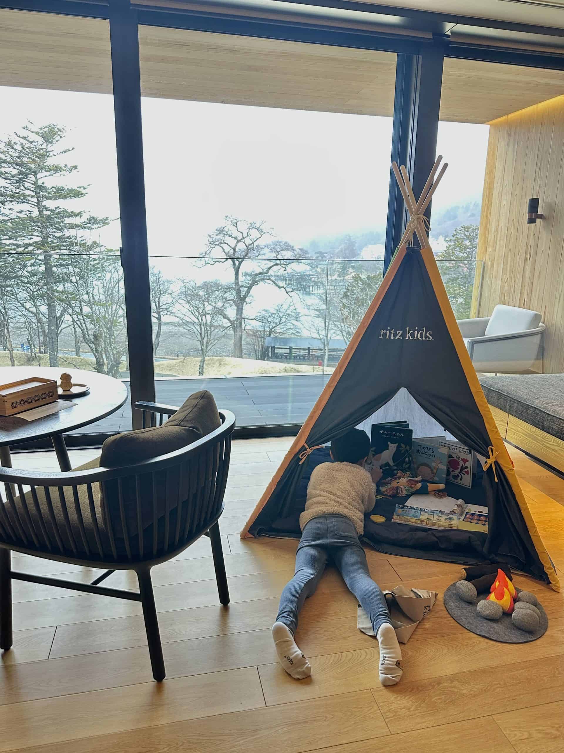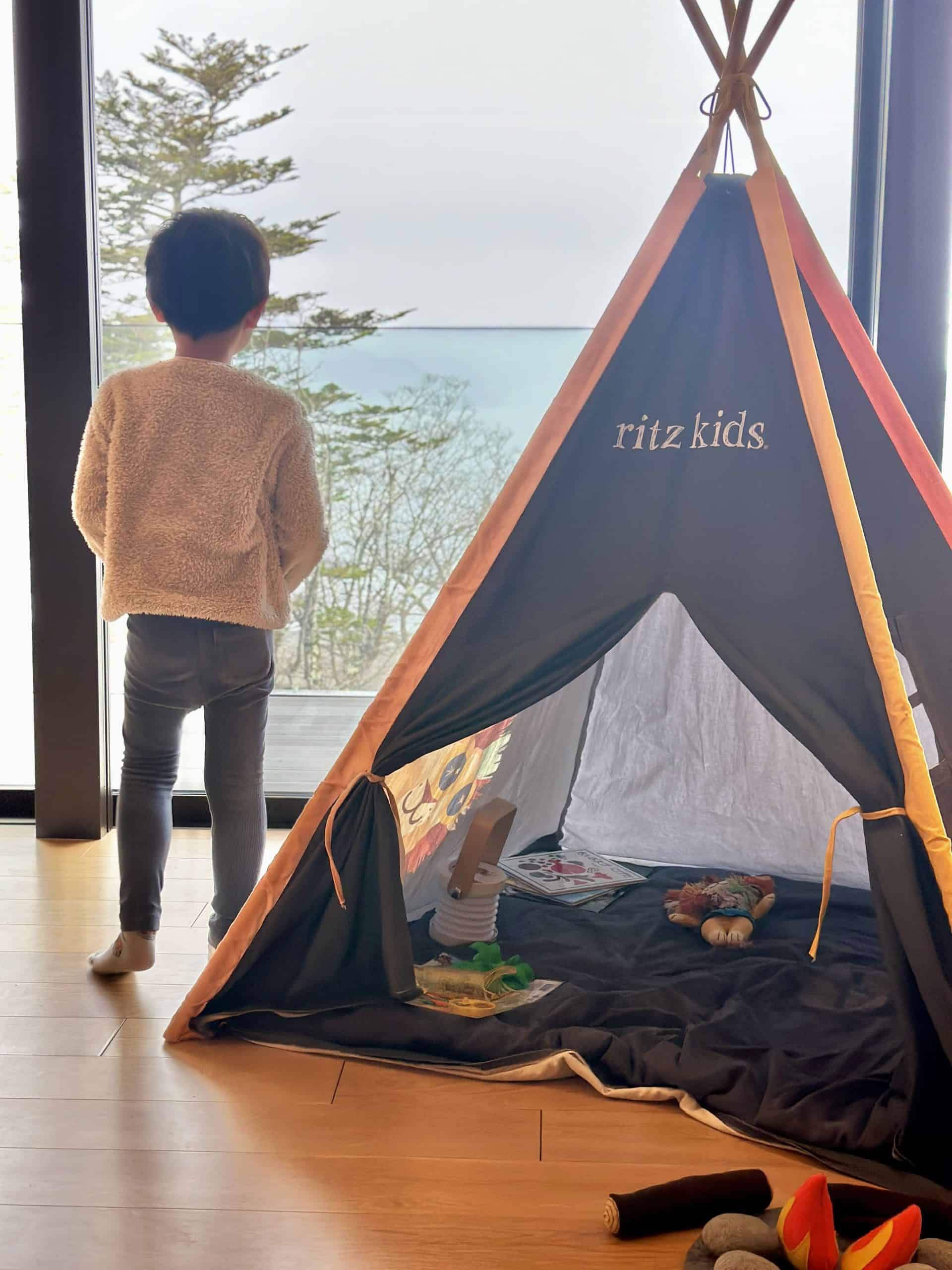 そして今回、お部屋に用意していただいた「サファリテント」。これがまた息子のツボにハマったようで、見た瞬間から歓喜、一度入るとまったく出てこない(笑)