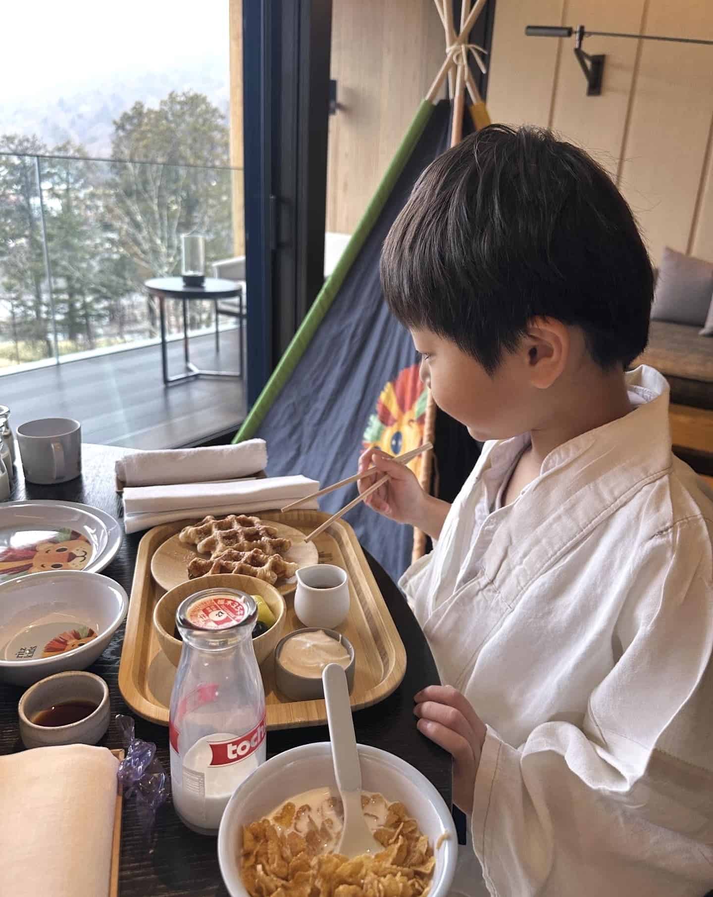 朝ごはんはのんびりお部屋で。息子は甘いシロップと生クリームをかけたクロワッサンワッフルが相当お気に入りだったよう。私は目にも美しい和朝食に朝から幸せを感じました。