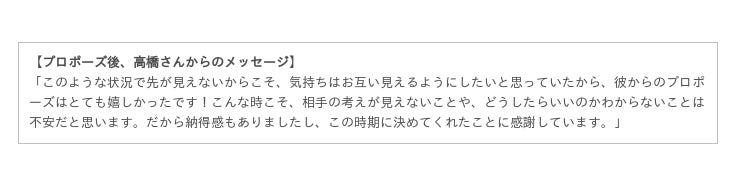 彼女にはサプライズで決行。お昼頃、LINE電話をしたところ愛犬のお散歩をする彼女。彼は意を決し、画面越しにダイヤを渡してプロポーズする。— 彼女は驚くものの「私を選んでくれてありがとう」と返し、晴れて婚約へと至りました。