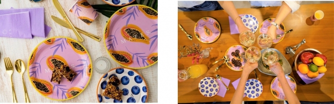 全5種類(Fruits Trip・Sicilia Lover・Love yourself・Dream High・Girls Night)のデザインによるホームパーティーグッズを用意しています。それぞれ、単品(紙皿、ナプキン、コップ、カトラリー)とセットで販売しております。シーンに合わせてお選びいただきご使用いただけます。(詳細はMATES.ストアをご覧ください)