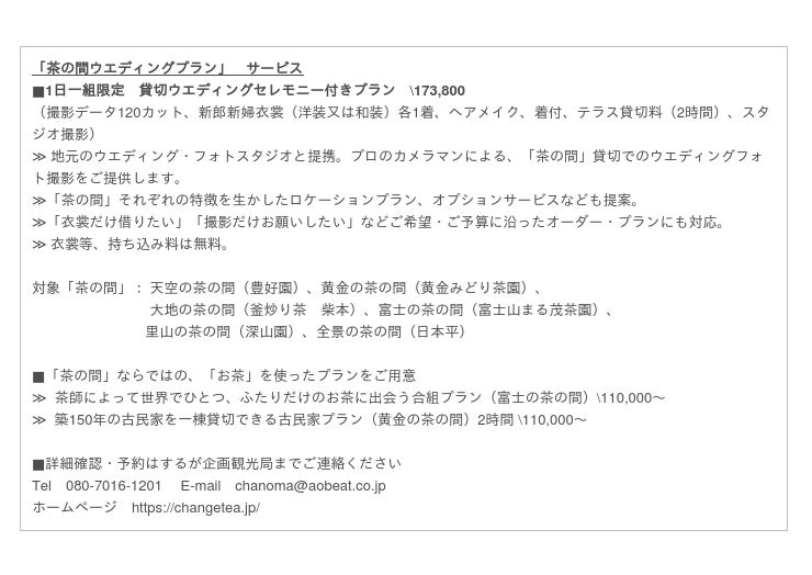 360度茶畑に囲まれた絶景パノラマを舞台に、ウエディングコスチュームでの撮影をお愉しみいただけます。貸切プランなので、withコロナの3密を避けたウエディングスタイルとしてもおすすめ。茶畑の美しい深緑、駿河湾や富士山を望むここでしか得られない絶景は、お二人の門出にふさわしい特別な1枚を撮影いただけます。