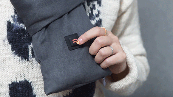 モバイルバッテリーに接続し、ボタンを押すだけで、マフラーに内蔵されたグラフェン発熱シートが素早くあたたまります。