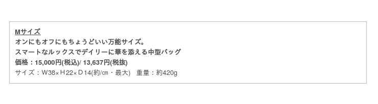 ちょっとした外出にぴったりなSサイズから、化粧ポーチやタブレットなどを収納できるMサイズ、ノートPCやA4書類が入るLサイズの全3サイズを用意。持ち物の多さなど生活スタイルにあわせてセレクトできます。