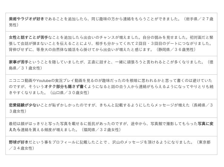 ■ プロフィールに追加した情報で「これを書いてから出会いが増えた」