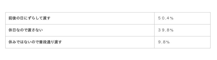 今年のバレンタインデーは、日曜日です。職場の人にチョコを贈る人限定で、「バレンタインデー当日に会わない人にもチョコをあげますか?」と聞いたところ、「前後の日にずらして渡す」人が50.4%でした。義理チョコは「2月14日」でなくても渡す職場の方が多いようです。