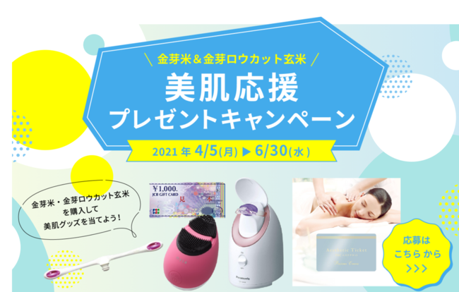 これらの実証結果も踏まえて、改めてコメ本来の栄養価値を残したコメ「金芽米」「金芽ロウカット玄米」を食べていただくことで、皆様に健やかな日々を送っていただけることを目指して、「金芽米&金芽ロウカット玄米 美肌応援キャンペーン」を実施します。今回実施するキャンペーンは、「金芽米」「金芽ロウカット玄米」の生米を購入した方が対象で、1.美肌グッズ3種がそれぞれ10名様、合計30名様に、更に2.美肌グッズが外れてしまった方のなかからエステチケット、商品券がそれぞれ50名様、合計100名様に抽選で当たります。