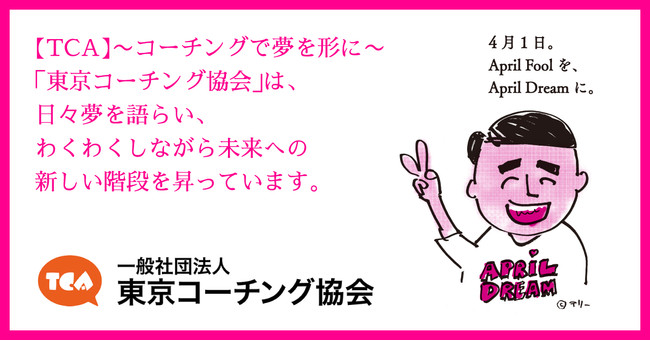 当社は、「April Dream 4月1日は、夢の日。」に参加しています。このプレスリリースは「東京コーチング協会(T C A)」のApril Dreamです。しかし、私たちが「夢」というタームで語るのは、絵空事ではなく、必ず実現できるもの、実現すべきもの、として捉えています。