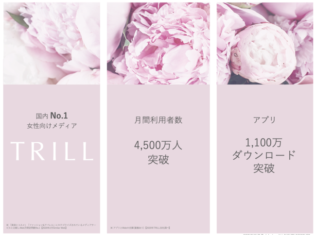 「TRILL」は200社を超えるコンテンツパートナーから提供される記事のうち、良質なコンテンツのみを厳選して掲載する女性向けメディアです。月間利用者数が4,500万、アプリダウンロードが1,100万を超える巨大メディアであり、ファッション・恋愛・結婚・お金・ライフスタイルなど、あらゆるユーザーのニーズを満たすバラエティ豊かなコンテンツを保有しています。