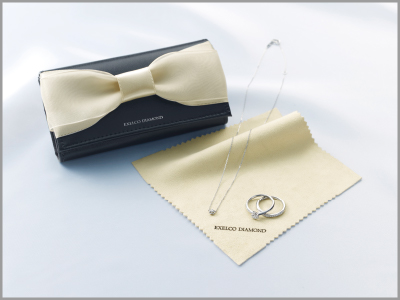 エンゲージリングをご成約いただいた方に、ダイヤモンドカッターズブランドとして、EXELCO DIAMONDの輝きを常に美しく保っていただき、日頃から常に上質なものを身につけていただきたい、という想いから「ダイヤモンド専用クロス付きジュエリーポーチ」をプレゼントいたします。