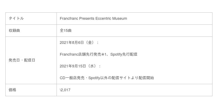 今回は、80年代の往年の名曲と最新ワールドヒットなどの名曲をカバーし、エキセントリックミュージアムの不思議なアレンジ感を纏い生まれ変わった15曲をラインアップ。国内外の実力派シンガーが歌唱し、全て国内ヒットプロデューサーたちによるリアレンジ新録で収録しています。※1: Francfranc BAZAR(アウトレット店舗)ではお取り扱いがございません。