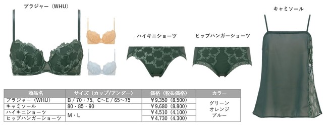 ブラジャー(WHU)はナチュラルなシルエットと軽い着用感が特長。ブラジャー、コーディネートアイテム共に、繊細なレースの魅力を存分にいかしたデザインに仕上げました。カラーはエレガントなネイビー、ソフトなブルー、華やかなイエローの3色です。