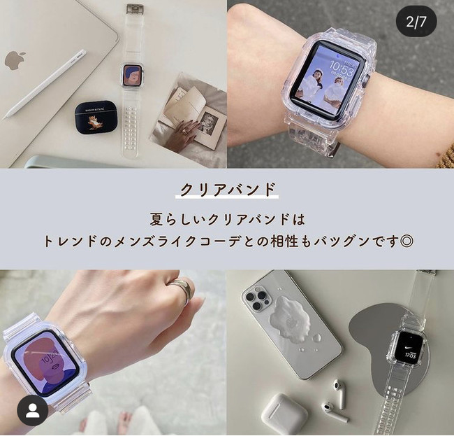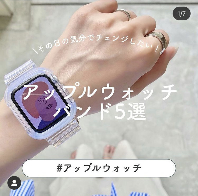 この投稿の場合、いつ、どんなファッションと組み合わせて使うのかがわかりやすい写真を使用しているため、ユーザーはどんなスタイルで時計のバンドを選ぶべきかイメージがつきやすくなるというメリットがあります。着用画像だけでなく、持ち物と一緒に撮影する「置き画」も一緒に採用することで、実際に使用している人の雰囲気や持ち物が訴求されやすくなっていることも、この投稿の特徴であるといえます。
