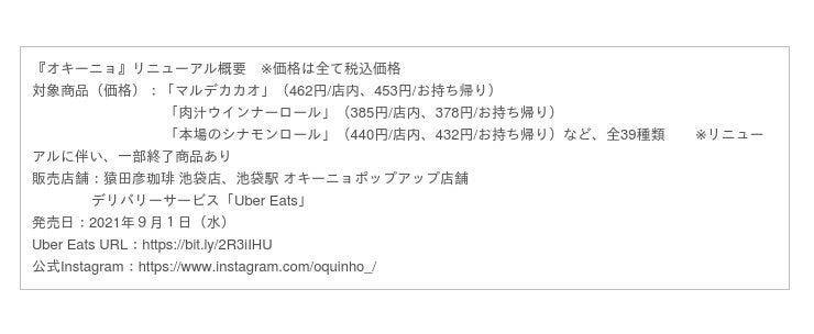 猿田彦珈琲株式会社(本社:渋谷区/代表取締役:大塚朝之)がプロデュースするベーカリーブランド「オキーニョ」は、開業2周年に際して、ご好評いただいている定番商品をリニューアルし、2021年9月1日(水)より販売いたします。リニューアルに伴い、新商品やオキーニョ専用のオリジナルパッケージも登場いたします。さらに、2018年に出店した南青山のポップアップ店舗でご好評いただきました特製クリームソーダを、2021年9月1日(水)より期間限定で発売いたします。