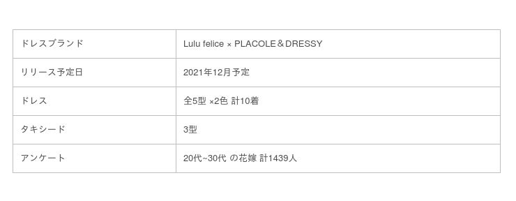 ドレスメーカー クラウディアのオリジナルブランド「ルルフェリーチェ」と花嫁アプリ「PLACOLE&DRESSY(プラコレ&ドレシー)のコラボが決定、2021年冬に発表、全国のドレスショップ・結婚式場等に販売を開始致します。花嫁のニーズを重視し変化しつづける老舗メーカーと、InstagramなどのSNSを中心に花嫁のビッグコミュニティを持つPLACOLE&DRESSYが花嫁のリアルな声を集め、今、このコロナ禍でも、「このドレスを着たい」と思わせる1着を作るためにコラボスタートすることが決定しました。