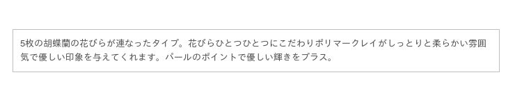 今回のオリジナルアクセサリーはポリマークレイで作られた胡蝶蘭がモチーフ。しっとりした質感や柔らかい雰囲気でハンドメイドならではの優しい花びらの印象になります。胡蝶蘭の花言葉は「幸福が飛んでくる」「純粋な愛」身につけるだけですべての女性たちに幸せをもたらすそんなイヤーアクセサリーが完成しております。