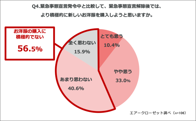 「Q4.緊急事態宣言発令中と比較して、緊急事態宣言解除後では、より積極的に新しいお洋服を購入しようと思いますか。」(n=106)と質問したところ、「全く思わない」が15.9%、「あまり思わない」が40.6%という回答となりました。