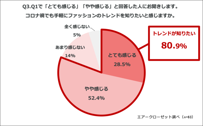 「Q3.Q1で「とても感じる」「やや感じる」と回答した人にお聞きします。コロナ禍でも手軽にファッションのトレンドを知りたいと感じますか。」(n=63)と質問したところ、「とても感じる」が28.5%、「やや感じる」が52.4%という回答となりました。