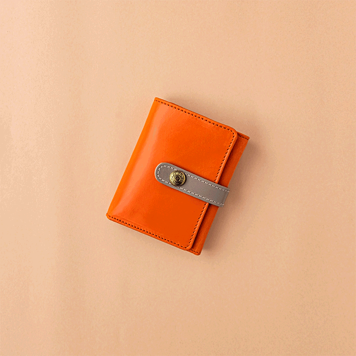 小さなバッグでもかさばらない手のひらに収まるコンパクトさと、使い勝手を両立するグレイスコレクションの人気モデル、三つ折り財布。ゴールドのスナップボタンを外すと、中はタブと同カラーのブライドルレザーが配されています。
