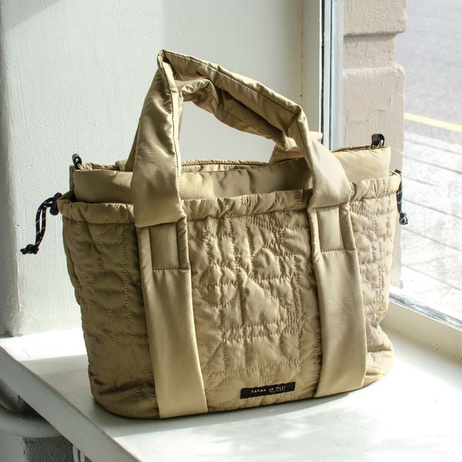 ふんわりとして、からだに沿って、持ち心地バツグン。SAANA JA OLLIのテキスタイルをキルティングで表現したサイズの大きな、収納 力抜群のバッグです。習い事や近場の公園、小さな旅にうれしいサイズ感で、物が少ないときはサイドのしぼりひもをギュッと引けば、ころんと愛らしいフォルムになります。
