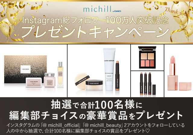 これを記念して、「michill byGMO」の「おしゃれもキレイも、明日のワタシにちょうどいい」のコンセプトにちなんで編集部がセレクトした豪華プレゼントが当たる「michill byGMO Instagram総フォロワー100万人突破記念プレゼントキャンペーン」を本日2021年12月17日(金)より展開いたします。