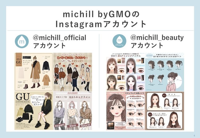 「@michill_official」のアカウントではオリジナルのイラストをメインに、季節に合わせた流行コーデなどフォロワーがすぐにでも取り入れられるファッション情報などを投稿する一方で、「@michill_beauty」のアカウントでは誰でも簡単に垢抜けられるメイクやヘアアレンジのHOWTO、お悩み解決コンテンツをお届けしており、20~30代を中心に多くの女性から支持をいただいております。