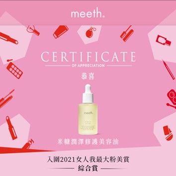 「粉美賞」は、最新のコスメやファッションを紹介する台湾で人気のテレビ番組「女人我最大」が主催し、台湾のみならず世界中の美容ブランドがエントリーする、年に一度の台湾美容界のアカデミー賞と言われています。このたびmeethのマルチ美容オイルが、2021年ボディケア部門において「総合ボディオイル賞」を受賞しました。