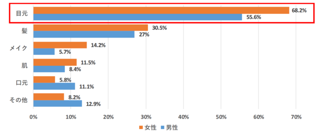 日常的にマスクを着用するようになり、オンライン会議など画面を通して相手の顔を見る機会が増えたことにより、他人の顔で目がいくようになった部分はあるか尋ねたところ、男女ともに「目元」(女性は68.2%、男性は55.6%)が最も多い回答で、次いで「髪」(女性は30.5%、男性は27%)に目がいくという結果になりました。マスクで隠れない目元や髪は、自然と目につきやすいようです。