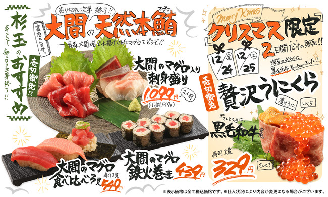 スシローブランドを持つ株式会社FOOD & LIFE COMPANIES(本社:大阪府吹田市、代表取締役社長 CEO:水留 浩一)の子会社である株式会社FOOD & LIFE INNOVATIONS(本社:東京都千代田区、代表取締役社長:木下 嘉人)は「鮨 酒 肴 杉玉」の全店舗において、12月24日(金)より、“大間”の天然本鮪を杉玉で初めて、期間限定で販売いたします。さらに、クリスマスの2日間限定で、しゃりを黒毛和牛のさしとろで巻き、うにやいくらを贅沢に盛りつけたクリスマス限定商品も登場します。