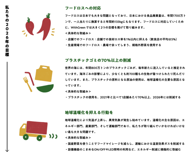 創業以来、日本の生産者と取り組み、地域社会を大切にしながら国産野菜の使用を継続してきたWithGreen。創業から5年、これまで大切にしてきた「サステナビリティ=持続可能な未来をつくる」をベースに、環境問題、日本の農業やフードロスをはじめとした課題と向き合い、子供たちやその先の時代までバトンを繋いでいくというコンセプトから、2021年に『ウィズグリーン・サステナブルプラン』を発表した。