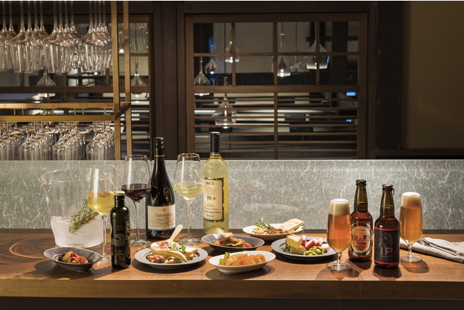 メニュー例: ボトルワイン(赤・白 各種)グラスワイン(赤・白 各3種)、おつまみ約20種(3種のナチュラルチーズと京鴨ナッツ、ガリシア産タコ&スモークモッツァレラのアヒージョ、サルシッチャのアーリオオーリオ、マスカルポーネいぶりがっこ、神戸牛のアヒージョなど)