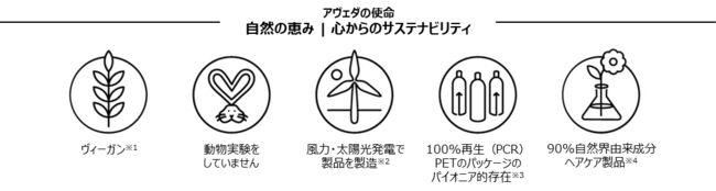 ※4 自然界由来成分とはISO16128の自然由来原料の定義に基づいたもので、成分の由来の大半が植物、非石油系ミネラルまたは水であることを意味します。また、90%はアヴェダ ヘアケア製品のアヴェダが算出したおおよその平均値です。