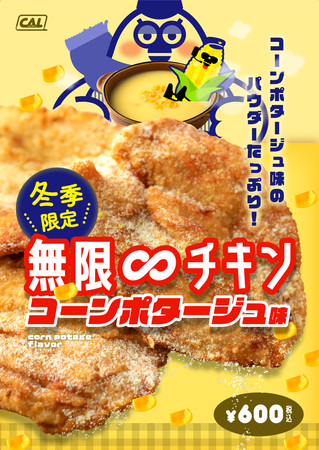 「無限∞チキン」は最大幅約15cmの骨なしフライドチキンです。冬季限定で発売するコーンポタージュフレーバーは、どこかほっこり懐かしい味わいがポイント。好評発売中のサイドメニュー「無限∞濃厚スープ」チーズ&オニオンと合わせて、お客様の心と身体を満たすこと間違いなしです。