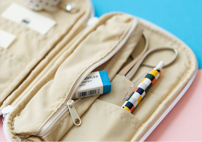 文具だけでなく、それを持ち歩くための収納アイテムもラインナップ。マスキングテープや付箋などの小物も一緒に収納できる「ペンケース」、ショルダーとしても使える「バッグインバッグ」などは細部にこだわった収納力で、学校でもオフィスでも活躍すること間違いなしです。