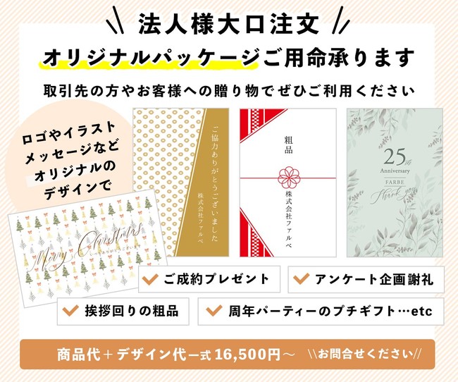企業様、店舗様からの大口注文も承ります。パッケージは、ブライダルと同様に、オリジナルデザインでのお作りが可能です。ロゴやイラスト、メッセージを入れて、ノベルティや謝礼、記念品、粗品など用途・ご希望にあわせてお作りいたしますので、効果的な販促アイテムとしてもご活用ください。