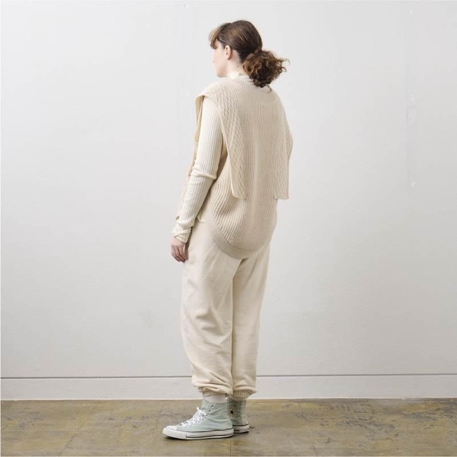 季節の変わり目のレイヤードスタイルにぴったりな大きめのアラン柄のベスト 。