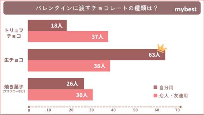 次のアンケートでは、恋人や友達など、プレゼント用に渡すチョコレートと、自分用でのチョコレートの種類について調査しました。結果、自分用には生チョコを選ぶ人が63人と最も多く2位の焼き菓子の倍以上の票差を付けトップ。恋人・友達へのチョコレートとしても最も人気がありました。一方で、トリュフチョコは自分用に比べ恋人・友達用が多く、2倍以上の差が出る結果に。自分用は生チョコを選んだ人でもプレゼント用はトリュフや焼き菓子を買っていると答える女性も多く、生チョコは常温で日持ちしにくいことから他の人に渡す場合は避けている人が一定数いるようです。