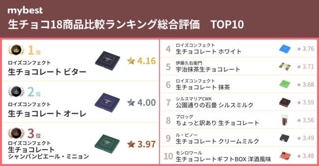 最後に、生チョコの総合評価ランキングTOP10をご紹介します。記事の中では、それぞれのチョコレートの魅力や詳しい評価ポイントも解説しています。