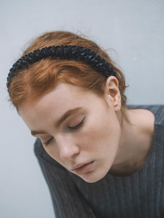 クルーネックやVネックなど、首周りがすっきりしたトップスとの相性がいい、立体的なヘッドバンドです。
