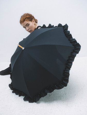 ふちにぐるりとフリルをあしらった傘は、京都の老舗傘メーカーに特別にオーダーした、IRIS47のオリジナルデザイン。地厚な素材と大胆なフリルとを組み合わせることで、“ガーリー”ではなく、大人のファッションに似合う“ロマンティックモード”に着地。またハンドルにはバンブー、中棒には楓を使用し、閉じても差してもシックな雰囲気をキープ。紫外線カット&撥水加工を施しており、晴雨兼用でお使いいただける長傘です。